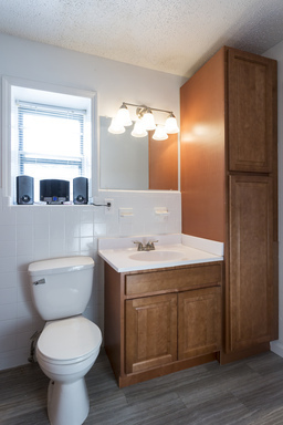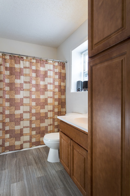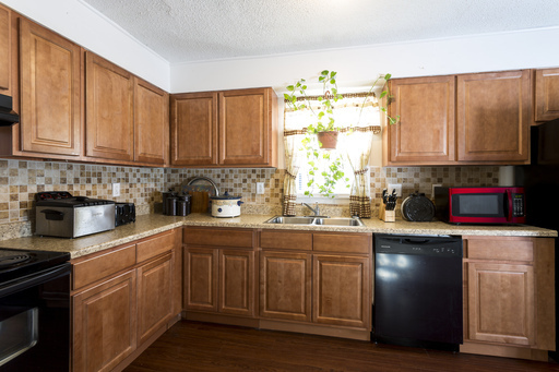 The master bedroom has a large walk-in closet with storage shelves. The living room and bedroom windows measure 44 ¾ x 70 ½, and the kitchen window measure 32 ½ x 50 ½. The counter tops are butcher block or Formica and the sinks are stainless steel. The walls are painted off white for easy matching.