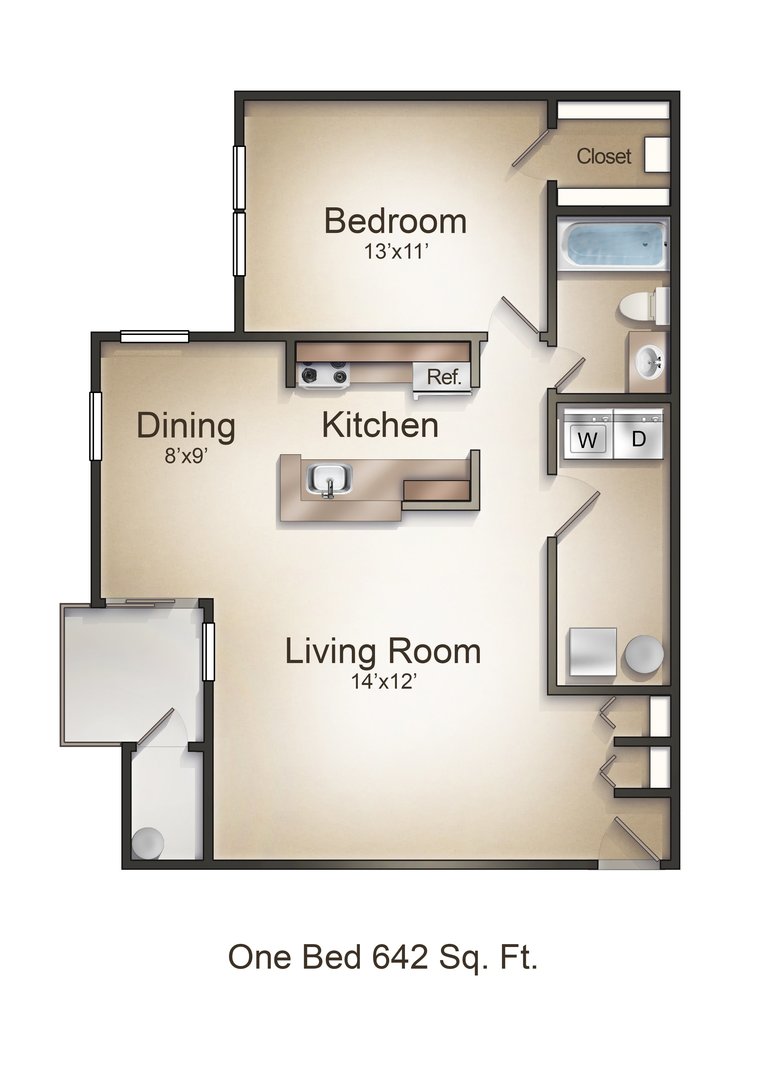 Our 1BD/1BA home has 642 square feet of heated space. The kitchen cabinetry provides amply storage of all your needs. The kitchen/dining room combination comes furnished with a range, frost-free refrigerator, garbage disposal and stainless steel sink. The master bedroom has a large walk-in closet with storage shelves. The living room and bedroom have large, light-filled windows. The walls are painted off white for easy matching. The floors consist of inlaid linoleum, and wall-to-wall carpeting.