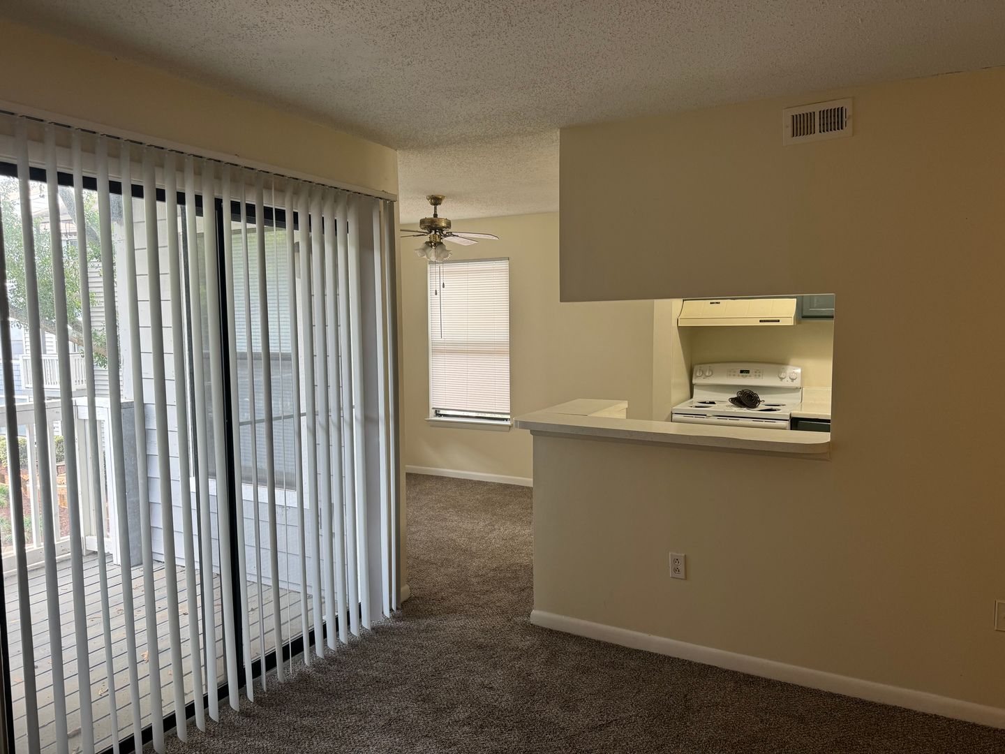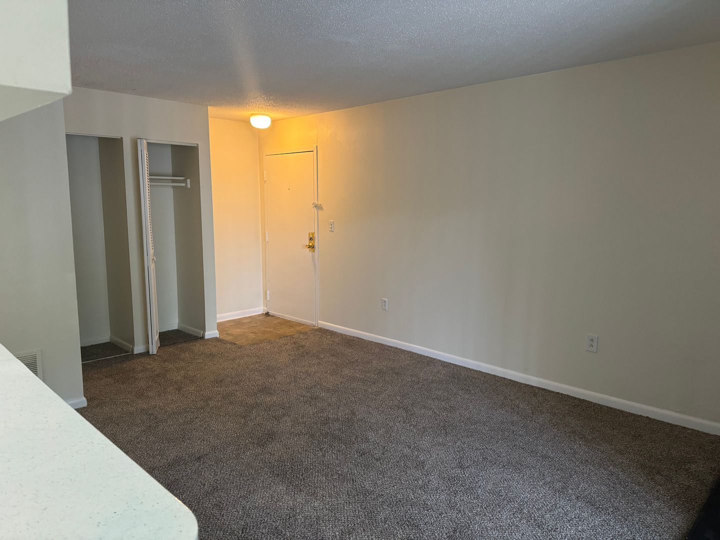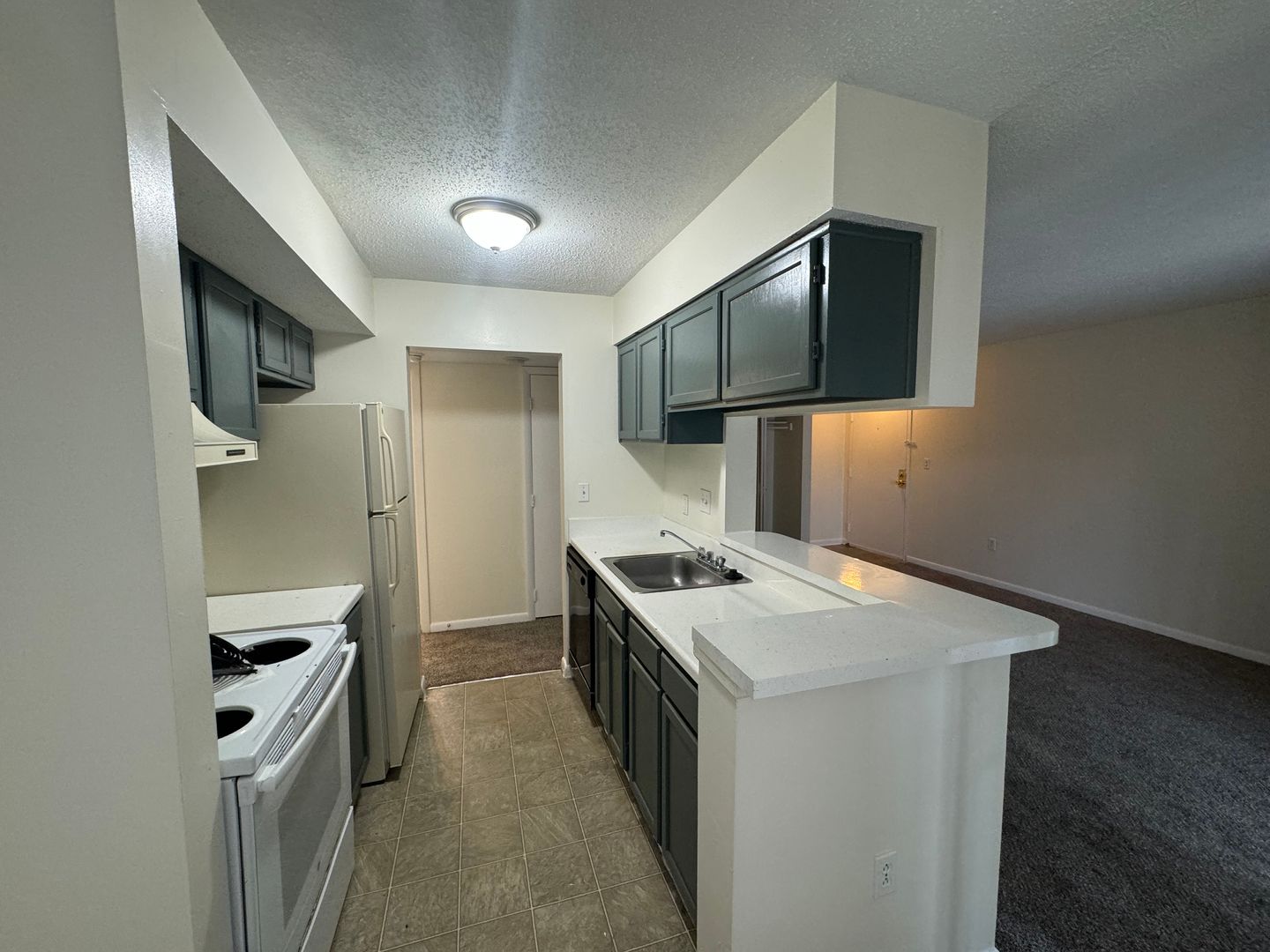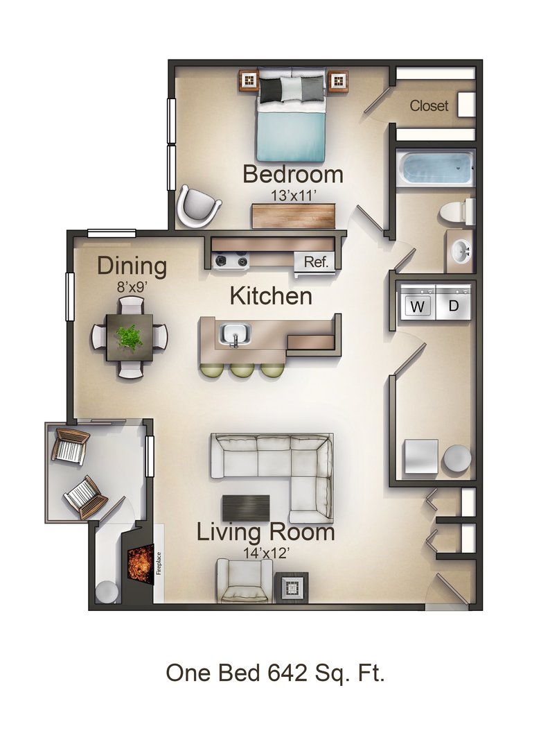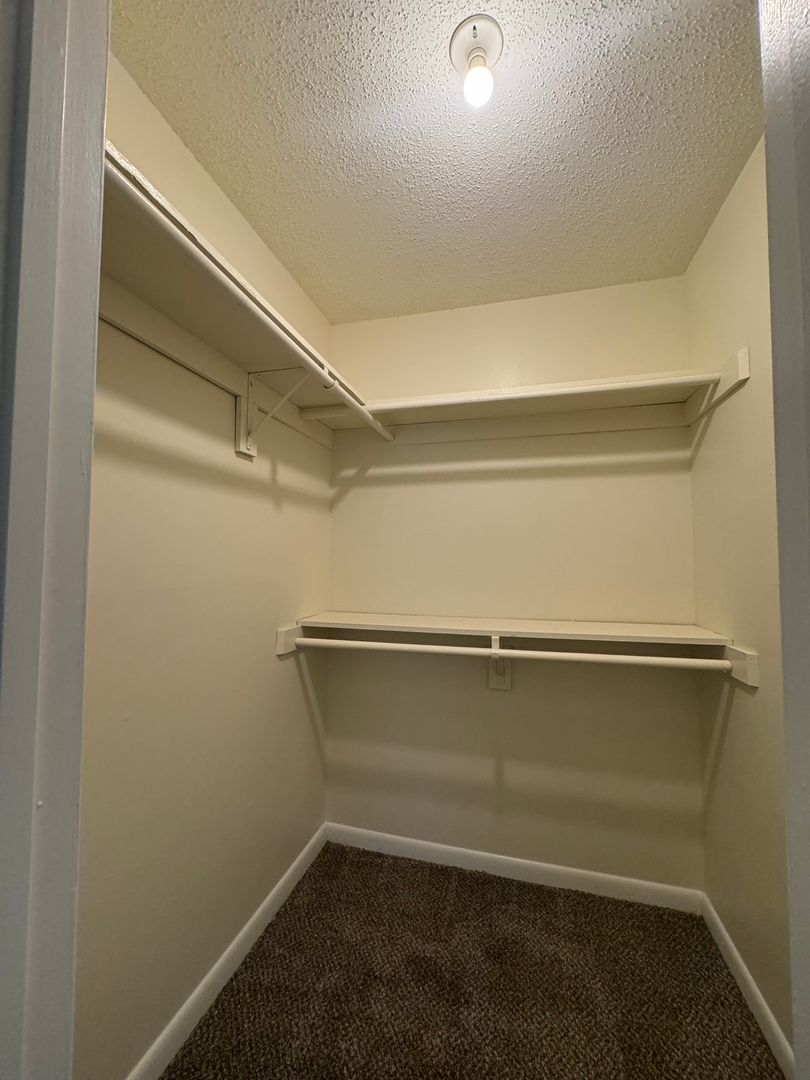 Our 1BD/1BA home has 642 square feet of heated space. The kitchen cabinetry provides amply storage of all your needs. The kitchen/dining room combination comes furnished with a range, frost-free refrigerator, garbage disposal and stainless steel sink. The master bedroom has a large walk-in closet with storage shelves. The living room and bedroom have large, light-filled windows. The walls are painted off white for easy matching. The floors consist of inlaid linoleum, and wall-to-wall carpeting.